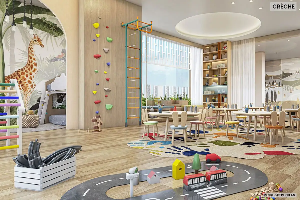 Life at Narang Vivenda This is a sanctuary where modern, contemporary architecture blends perfectly with the best of Mother Nature. There are 3 acres of landscaped greens over multiple avenues of exploration. Recharge each day by walking through groves of trees in our Miyawaki Forest or taking laps in our 25-metre lap pool in the heart of Malad West. State-of-the-art gymnasium and fitness station Grand banquet hall Recreational game room Créche 25 mt. lap pool Multipurpose court Miyawaki forest Pickleball court