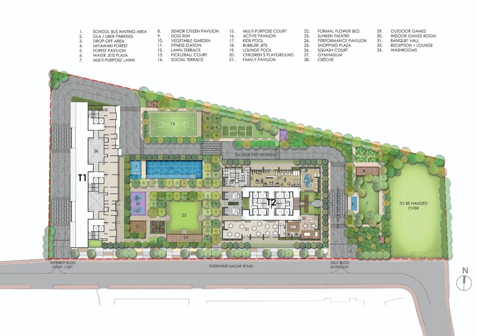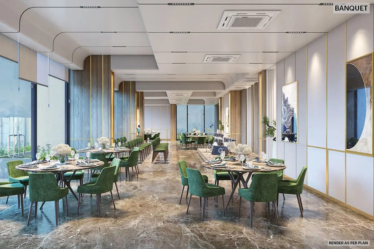 Life at Narang Vivenda This is a sanctuary where modern, contemporary architecture blends perfectly with the best of Mother Nature. There are 3 acres of landscaped greens over multiple avenues of exploration. Recharge each day by walking through groves of trees in our Miyawaki Forest or taking laps in our 25-metre lap pool in the heart of Malad West. State-of-the-art gymnasium and fitness station Grand banquet hall Recreational game room Créche 25 mt. lap pool Multipurpose court Miyawaki forest Pickleball court